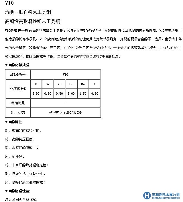 關于v10模具鋼,蘇州浩凱模具鋼公司提供v10模具鋼材價格,v10型號規格和對應牌號,v10性能_用途及化學成分_密度_硬度,v10圓鋼和鋼板多少錢一公斤.更多v10出廠狀態和回火淬火注意事項,馬上咨詢蘇州浩凱模具鋼公司在線客服.